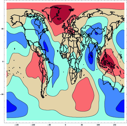 Doch selbst wenn man diesen Effekt numerisch korrigiert bleibt alles andere als ein homogenes Gravitationsfeld. Gut zu sehen ist das an unseren Auswertungen der frei zugänglichen Daten des GOCE Forschungssatelliten. Rot steht für Bereiche überdurchschnittlich hoher Gravitation, blau für niedrige :